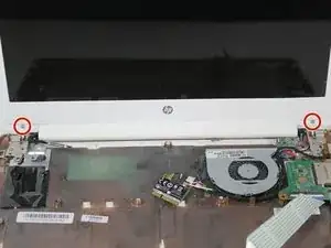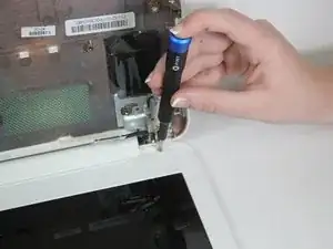 Используйте отвертку Phillips #0, чтобы выкрутить четыре винта 2,9 мм, которые крепят экран к верхней части корпуса ноутбука.