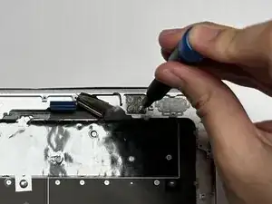 Найдите кабель динамика, соединяющийся с материнской платой в верхнем правом углу, и осторожно потяните вниз, чтобы удалить.