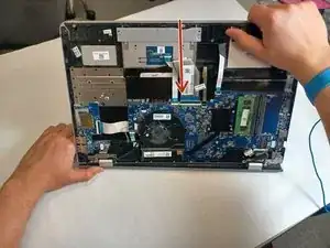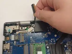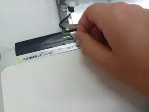 Отсоедините разъём кабеля дисплея, сняв наклейку с дисплея и аккуратно оттянув кабель от контакта.