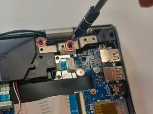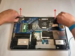 Чтобы отделить узел дисплея от узла клавиатуры, отведите петли дисплея от материнской платы.