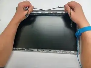 Отсоедините провода дисплея от фиксаторов, как показано.