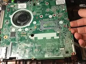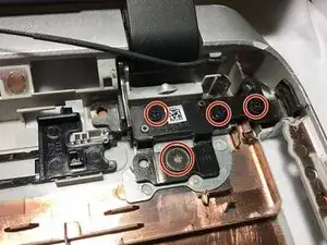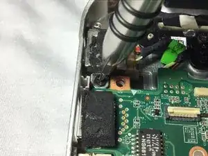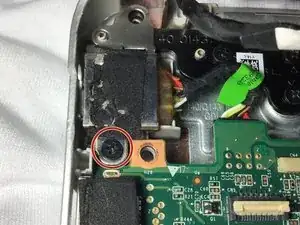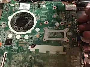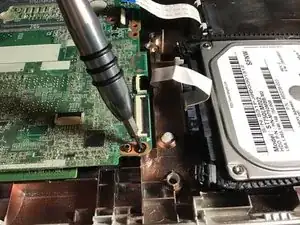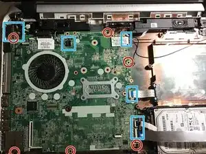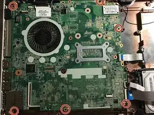Используя магнитную отвёртку с наконечником Philips #0, выверните все видимые винты в углах материнской платы ноутбука.