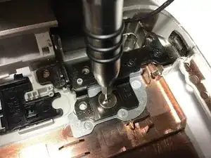Выкрутите три 5,5-миллиметровых винта вдоль края разъёма дисковода, используя крестовую отвёртку №0.