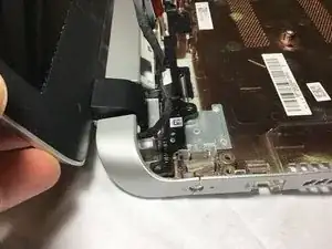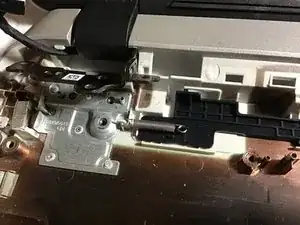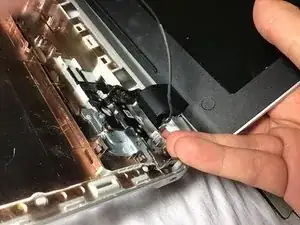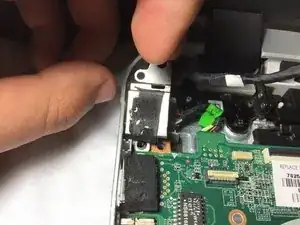 Отцепите фиксатор, удерживающий кабель кнопки питания.
