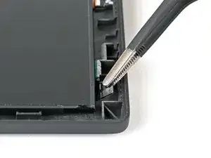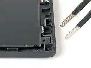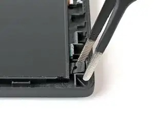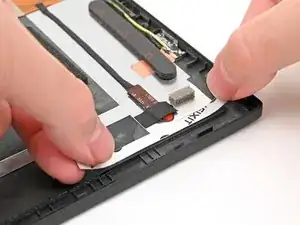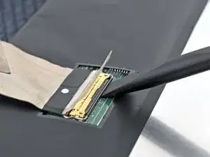Используйте чистый ноготь или плоский конец монтажной лопатки, чтобы аккуратно поддеть и приподнять металлическую защёлку разъёма кабеля дисплея и отщёлкнуть её.