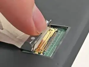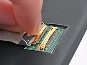 Используйте чистый ноготь или плоский конец лопатки, чтобы приподнять и отщёлкнуть металлическую защёлку на разъёме кабеля дисплея.