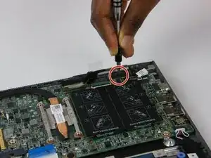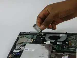 Отвинтите винт длиной 2 мм, который держит WLAN-карту. Затем осторожно извлеките WLAN-карту из материнской платы.