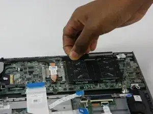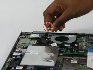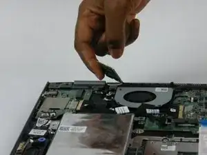 Потяните черный язычок кабеля батареи к батарее, чтобы отключить его от материнской платы.