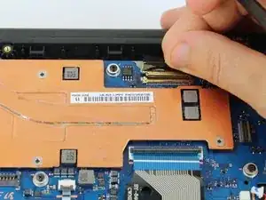 Разомкните золотой разъём, соединяющий дисплей и материнскую плату, приподняв шарнир лопаткой и аккуратно отсоединив его лопаткой или пальцами.