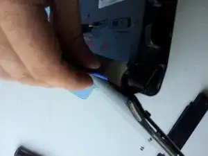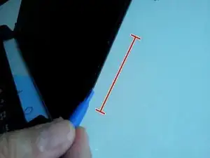 Начиная примерно с середины правой стороны, используйте пластиковый инструмент и аккуратно проведите им вверх-вниз вдоль стыка с лёгким давлением внутрь, пытаясь найти разделение между частями корпуса.