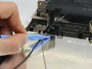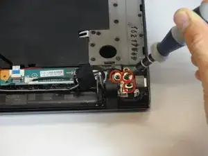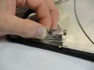 Используйте отвертку Phillips #1, чтобы выкрутить три винта 8,88 мм, крепящие металлический петлевой элемент в углу ноутбука.