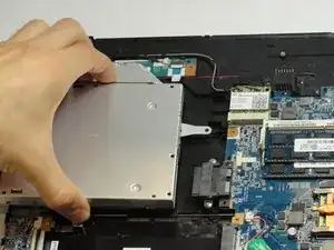 При снятии задней крышки также удаляется винт, крепящий оптический привод к ноутбуку. Это означает, что оптический привод готов к извлечению.