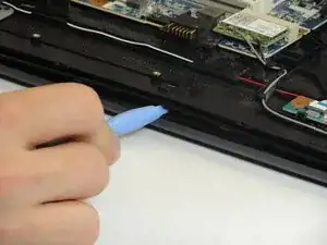 С помощью лопатки (spudger) снимите пластиковые накладки в четырёх углах дисплея.