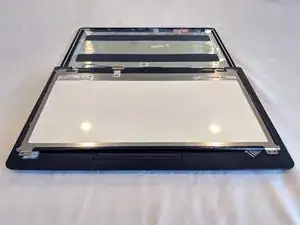 Осторожно отделите ЖК-панель от пластиковой крышки и опустите экран на клавиатуру.