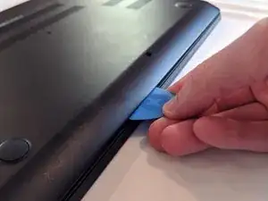 Проведите лопатку вдоль корпуса, надавливая внутрь, чтобы освободить защёлки, фиксирующие нижнюю крышку. Вы должны почувствовать и услышать, как защёлка освобождается.