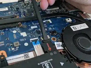 Плоским концом лопаточки поднимите замок кабеля и аккуратно выньте кабель дисплея из разъёма ЖК-панели.