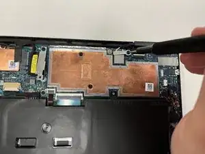 Отклейте ленту, которой кабель дисплея прикреплён к радиатору твердотельного накопителя M.2.