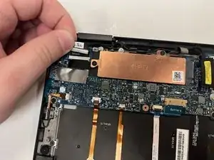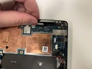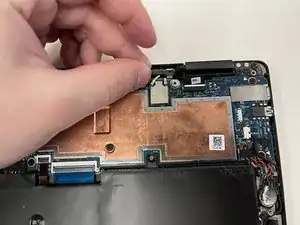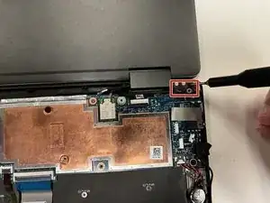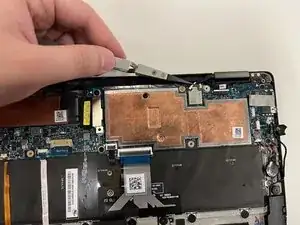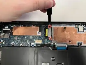 Используйте отвёртку Phillips #000, чтобы выкрутить два винта (M1.6x2.5), которыми скоба кабеля дисплея крепится к материнской плате.
