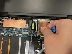Используйте отвёртку Phillips #000, чтобы выкрутить винт (M1.6x2.5), которым скоба беспроводной карты крепится к материнской плате.