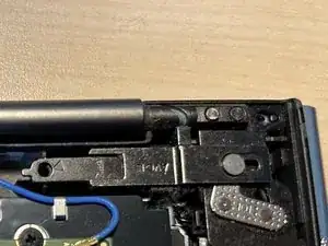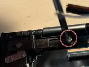 Если этого ещё не сделано на предыдущих шагах, вы найдёте два серебристых винта PH1 в верхних левом и правом углах у петель дисплея.