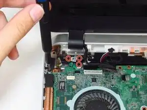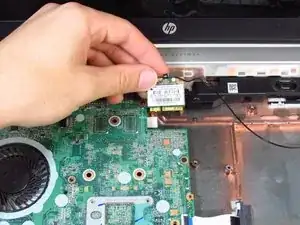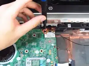 Выверните один фиксирующий винт на модуле беспроводной сети с помощью отвертки Phillips #00. После удаления винта модуль поднимется под углом.