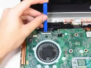 Используйте наконечник синего пластикового инструмента, чтобы аккуратно поднять черную фиксирующую планку кабеля, соединяющего материнскую плату с дисплеем.