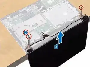 Снимите три винта (M2.5x8), которыми крепятся кронштейны петель дисплея к панели опоры для ладоней.