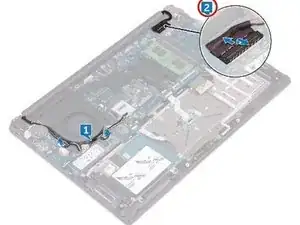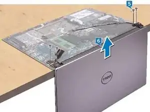 Снимите четыре винта (M2.5x5), которыми петли дисплея крепятся к опоре для ладоней и клавиатурному блоку.