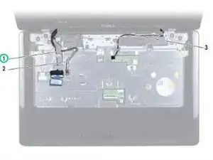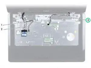 Обратите внимание на прокладку кабелей антенны Mini-Card и снимите кабели с направляющих.