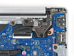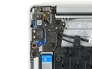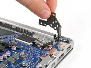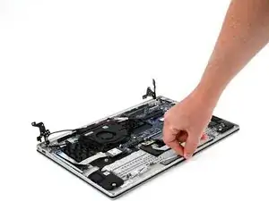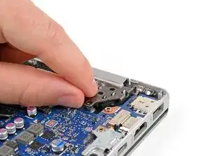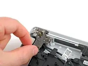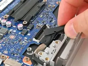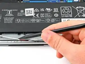 Используйте лопатку или пальцы, чтобы приподнять ленту, приклеивающую провода динамиков к металлическому кронштейну трекпада.
