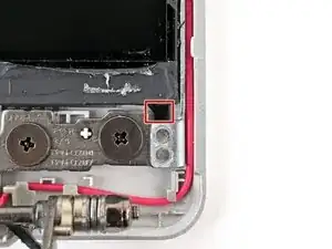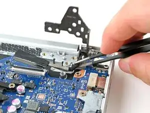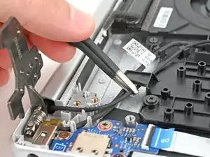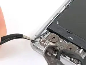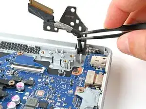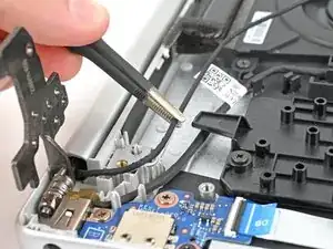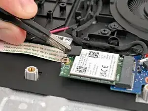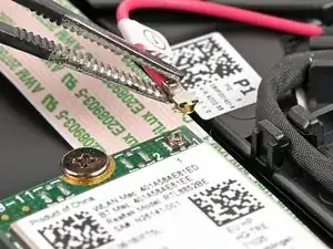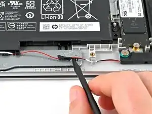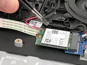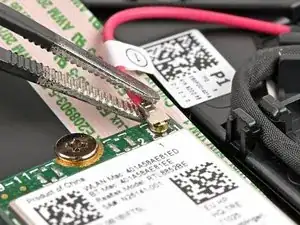 С помощью пинцета переместите антенну беспроводной сети из-под пластиковой планки, которая её прижимает.