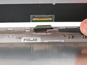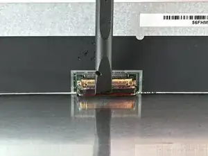 Используйте плоский конец лопатки, чтобы приподнять фиксирующую защёлку над разъёмом дисплея.