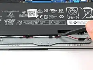 Используйте лопатку или пальцы, чтобы освободить провода динамиков из направляющих защёлок вдоль кромки аккумулятора.