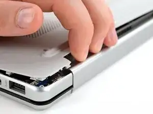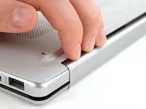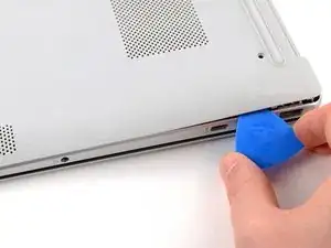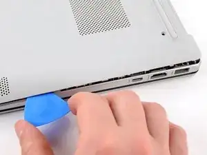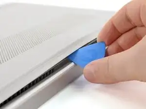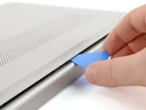 Вставьте медиатор для вскрытия под нижнюю крышку у задней части ноутбука.