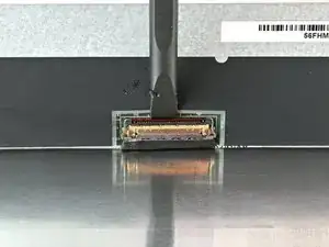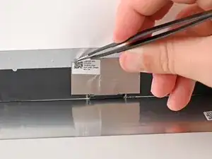 Пока панель дисплея удерживается или установлена под углом 90º, используйте пинцет, чтобы снять тканевую ленту, закрывающую разъём кабеля дисплея на задней стороне панели дисплея.