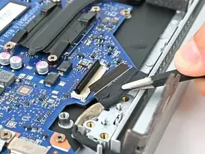 Захватите черную заклеенную часть кабеля дисплея пинцетом или пальцами.