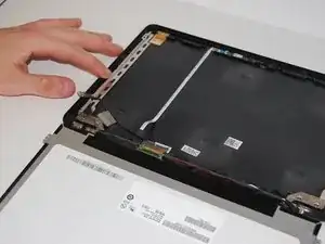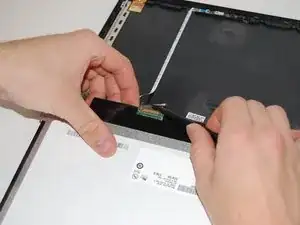 Аккуратно приподнимите панель и отогните её, чтобы открыть доступ к кабелю дисплея с тыльной стороны экрана.