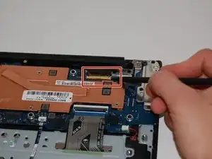 С помощью лопатки приподнимите фиксатор петли, удерживающий золотистый кабель дисплея.