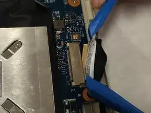 Отсоедините силовой разъём, отогнув ленту и сдвинув разъём назад при помощи синего инструмента для раскрытия.