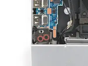 Используйте остриё лопатки или ноготь, чтобы поочерёдно надавливать с обеих сторон скользящего разъёма питания и полностью вывести его из гнезда рядом с левым шарниром.