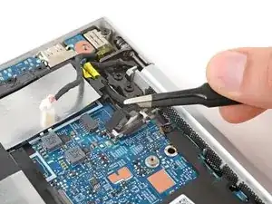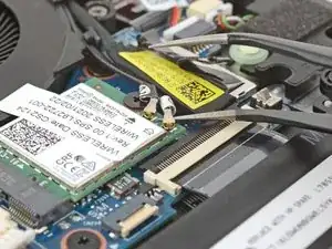 Вставьте одну лапку изогнутых пинцетов под металлическую шейку одного из коаксиальных разъёмов на модуле WLAN (Wi‑Fi), расположенном прямо под вентилятором.