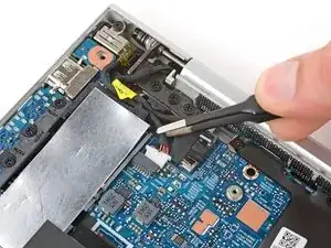 Используйте пальцы или пинцет, чтобы поднять кабели дисплея и антенн из их зажима рядом с правым шарниром.
