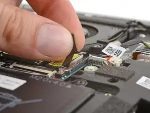 Возьмите пластиковую тягу левой плоской ленты разъёма с нажимным разъёмом дисплея пальцами, рядом с левым шарниром.