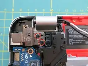 Затем удалите один винт 2.5x6 и один винт 2.5x4 с правой петли.
