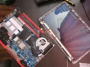 Теперь вы можете отсоединить ЖК-узел от остального корпуса. Четыре кабеля должны быть все еще подключены к ЖК: два провода антенны WLAN (черный, белый), дисплейный кабель и кабель веб-камеры.