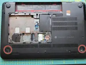 Удалите два винта: один рядом с маленькой резервной батареей, другой с левой части сервисного отсека.