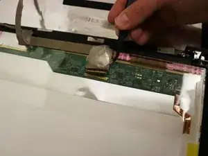 Осторожно отлепите прозрачную клейкую ленту, прикрепленную к основному ZIF‑разъему дисплея, с помощью пластиковой лопатки.