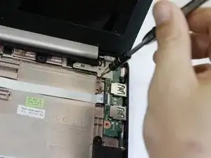 Используйте металлическую лопатку, чтобы отжать две ножки, расположенные ближе всего к петле ноутбука.