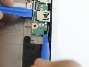 Используйте пластиковую лопатку, чтобы приподнять разъём, соединяющий тонкую ленту с синим наконечником с дочерней платой.