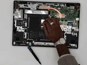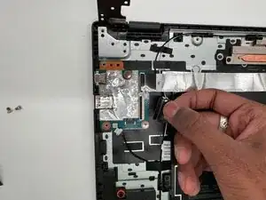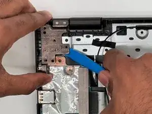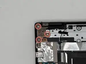 Открутите три винта Philips длиной 5 мм на левом шарнире дисплея.